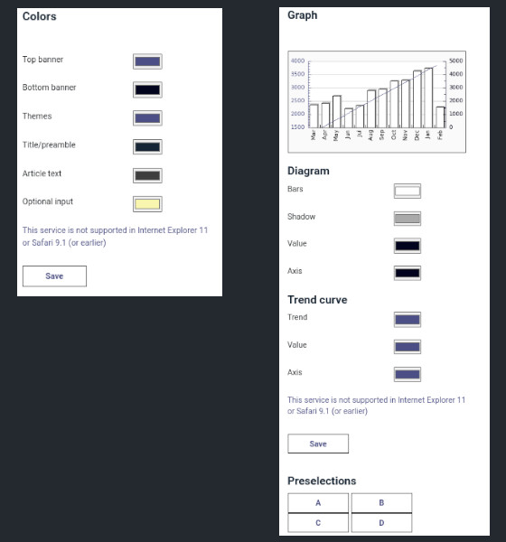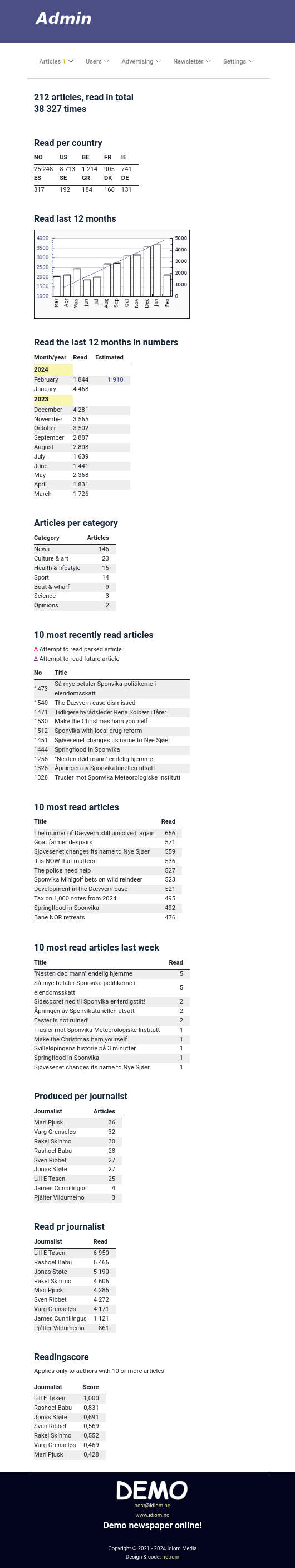 Our online newspaper system monitors visits per country, per month, per story and per journalist. To help your staff better to understand the interests-fields of your readers, the results is displayed in an score-diagram in real time. Forecasts are also calculated for the current month.<