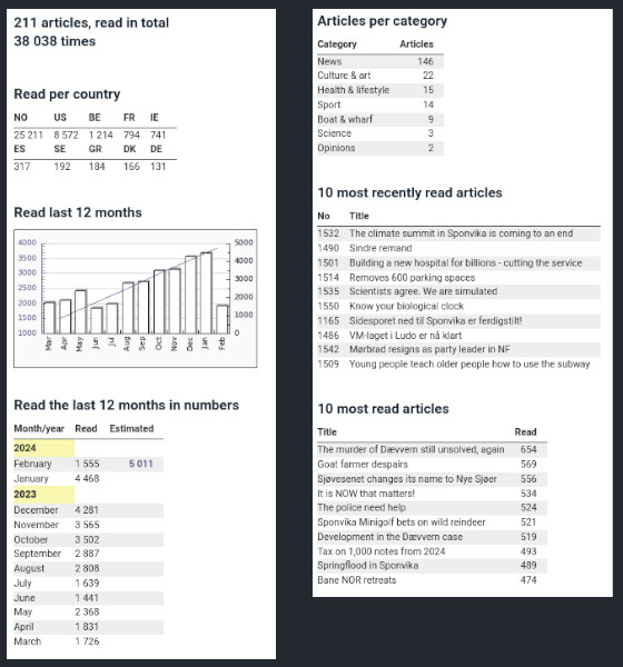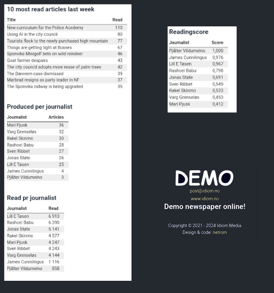 Our online newspaper system monitors visits per country, per month, per story and per journalist. To help your staff better to understand the interests-fields of your readers, the results is displayed in an score-diagram in real time. Forecasts are also calculated for the current month.<